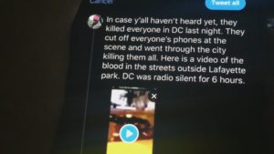 Monday the hashtag #dcblackout went viral on Twitter following a tweet that described horrifying moments in downtown DC. It claimed there was a blackout of all communication through cellphones so that no one protesting could tell followers what was happening. The original tweets included photos and videos. Twitter was besieged by these tweets which, according to the Washington Post, was first tweeted out by an account with just 3 followers.